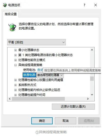 (2)将两个异类线程调度策略(图①和图②) 都改为“首选高性能处理器”,并确定。(此为修改的另外2处)