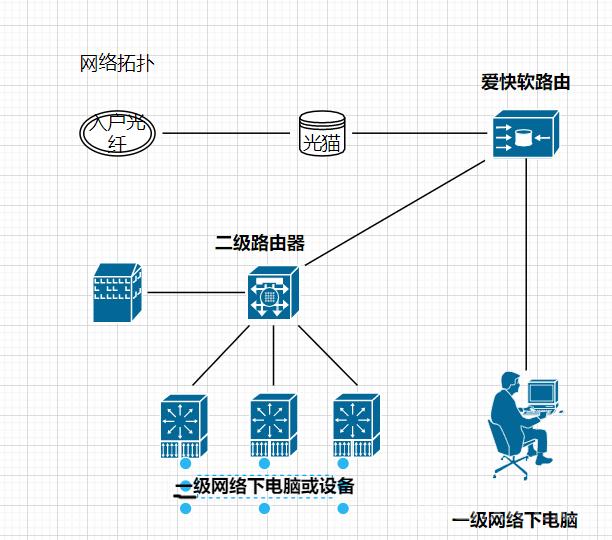时常需要管理二级路由器,但是直接访问不了一级路由分配给二级路由器的IP。查询相关资料,经过以下2步就可以达成。 家里的网络拓扑结构大致如下:
