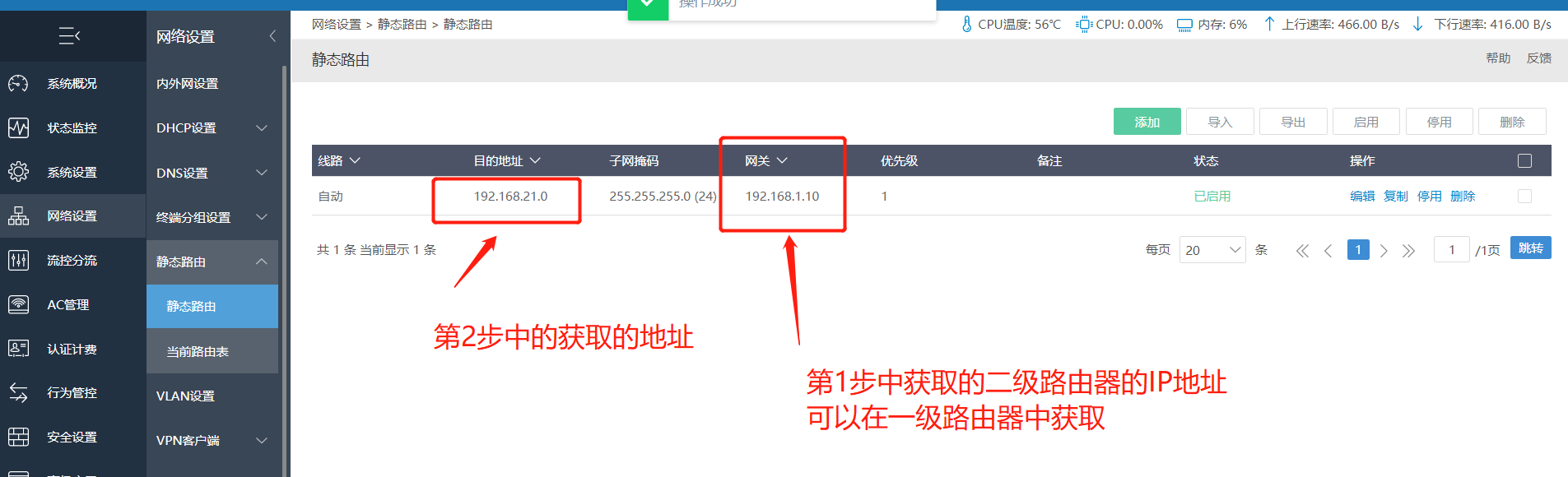 一级路由器的其中一个LAN口指向二级路由器的WAN口,先获取到二级路由器的WAN口IP,作为配置静态路由的网关。