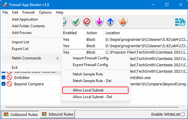 注意:当您启用白名单模式时,本地网络上的某些设备(例如打印机)可能无法正常工作,要解决此问题,您可以通过单击文件 - Netsh 命令 - 允许本地子网来允许本地网络上的设备