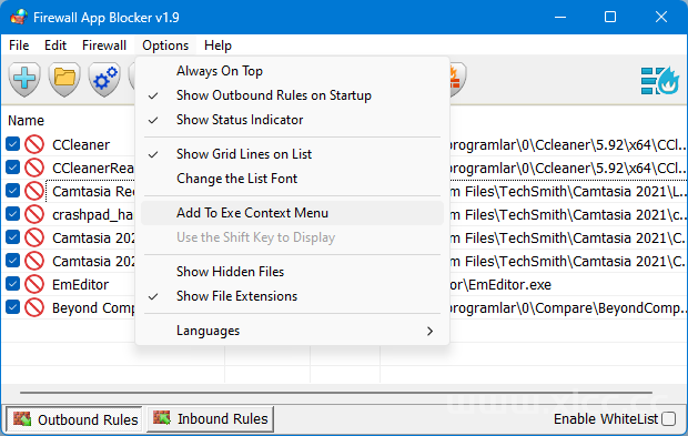 当从选项菜单中启用“添加到 exe 上下文菜单”功能时,您将能够直接从 Windows 资源管理器右键单击上下文菜单阻止/取消阻止特定应用程序,这将允许您右键单击任何 .exe 文件并轻松将其添加到 Windows 防火墙。此上下文菜单项可以更改为仅在按 Shift 键时显示。为此,请选择“使用 Shift 键显示”